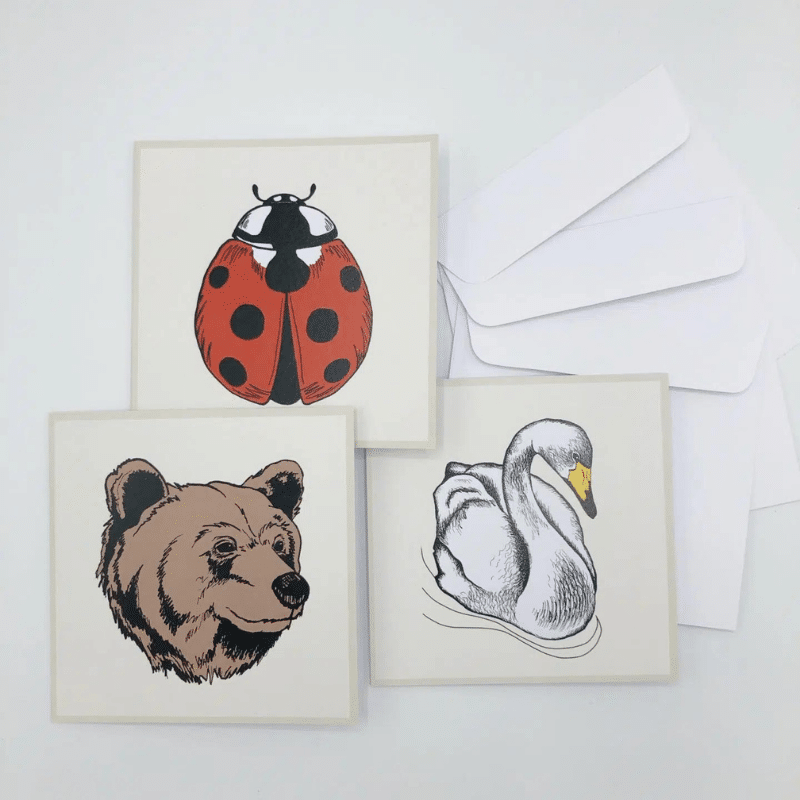 Kuvataitelija Ella Hällforsin kuvittamien onnittelukorttien aiheina ovat Suomen ylväs kansalliseläin karhu, sympaattinen kansallishyönteinen seitsenpistepirkko sekä viehkeä kansallislintu laulujoutsen.