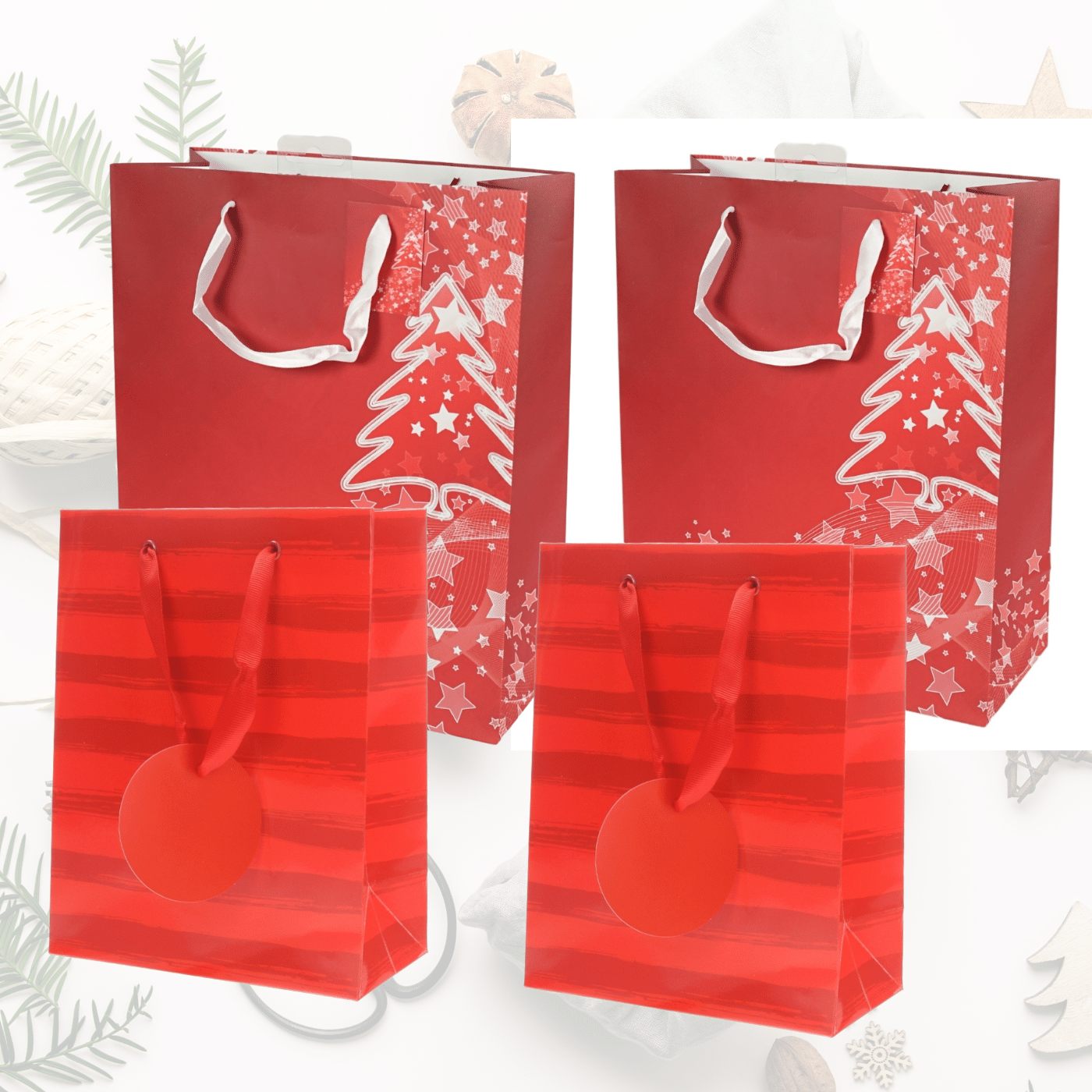 Tee lahjojen antamisesta vaivatonta ja näyttävää tämän 4 kappaleen setin avulla! Settiin kuuluu 2 kpl M-koon punaisia lahjakasseja sekä 2 kpl L-koon jouluaiheisia lahjakasseja, jotka sopivat täydellisesti niin joululahjoihin kuin muihinkin juhlahetkiin.