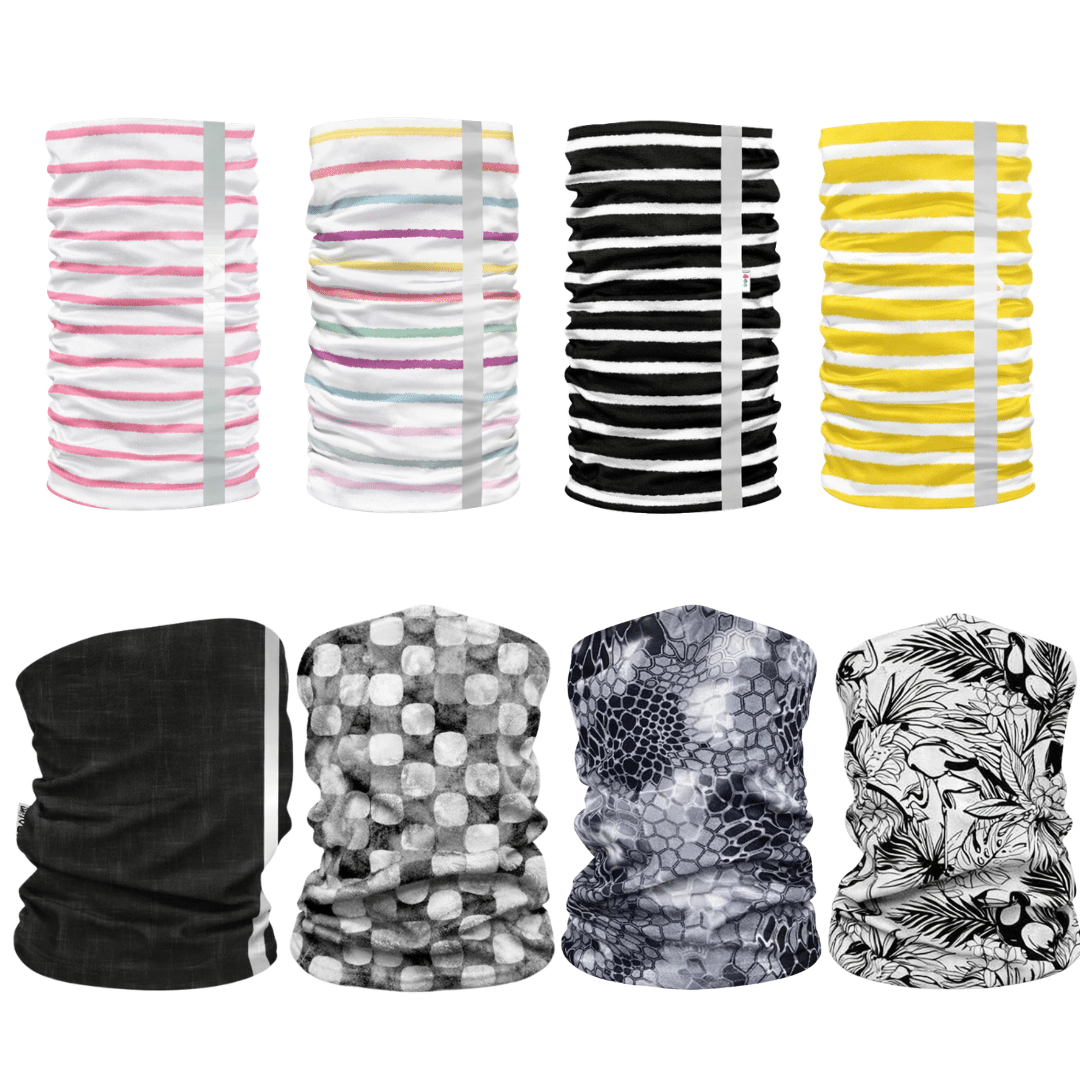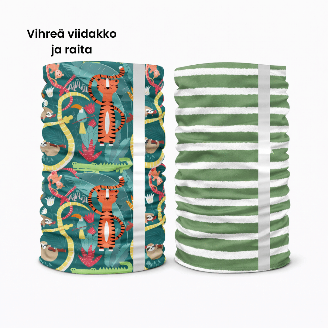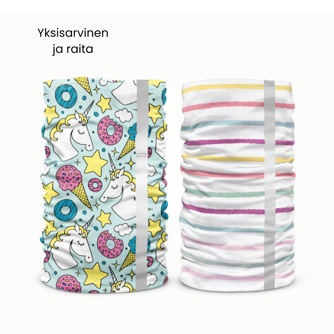 Heijastava tuubihuivi sopii lapselle ja aikuiselle. Monikäyttöinen huivi sopii kaulaan, päähän tai ranteeseen. Tuote on saumaton ja siinä on molemminpuoleinen vahvasti heijastava raita.