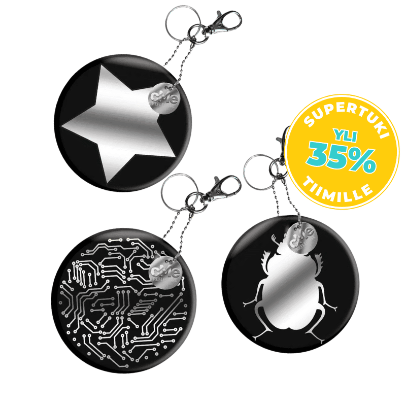 Oletko kuullut mustista heijastimista? Kyllä, nämä heijastavat laadukkaan heijastinkalvon vuoksi yhtä hyvin kuin vaaleatkin heijastimet. cMe heijastimet täyttävät EN13356 standardin ja ovat CE-hyväksyttyjä.