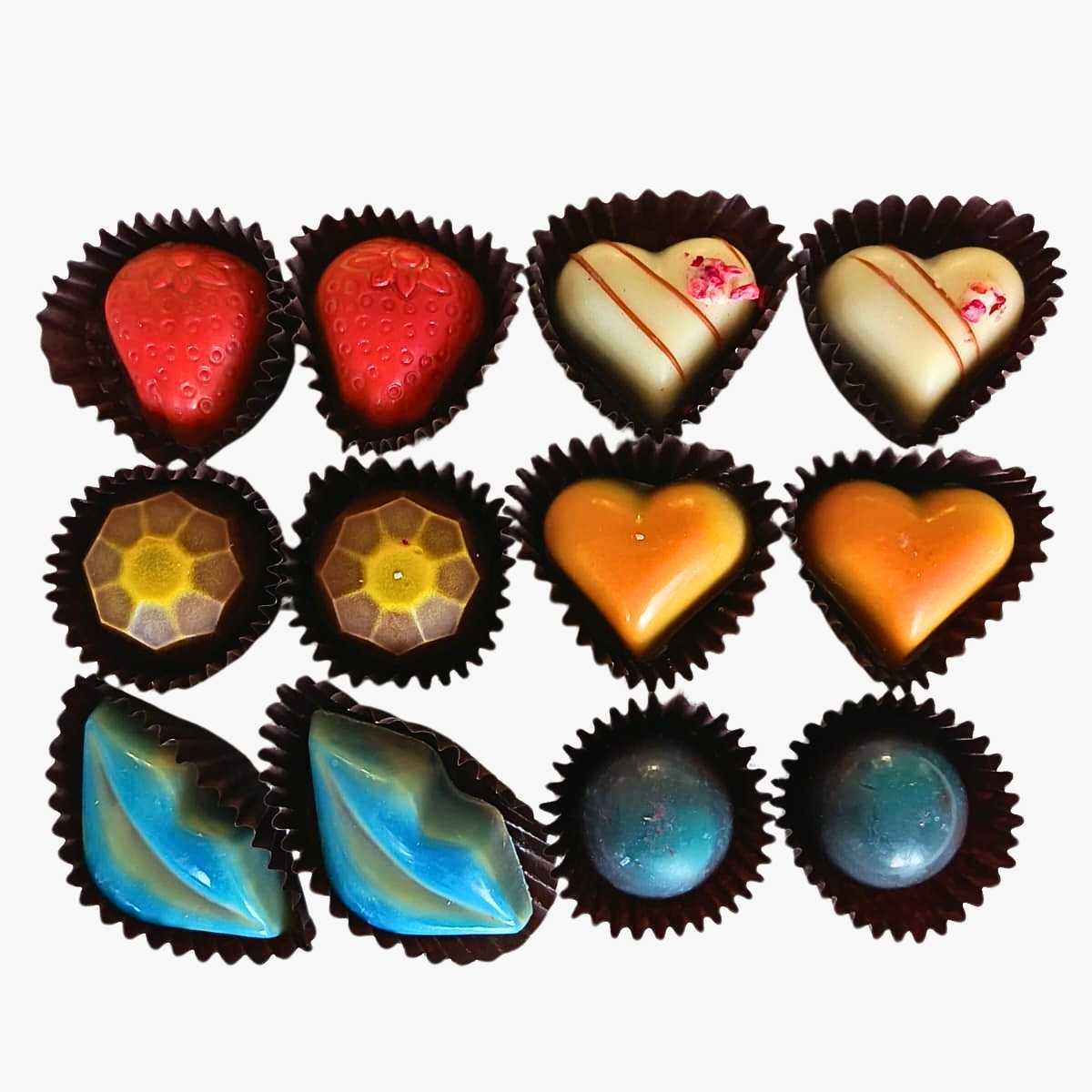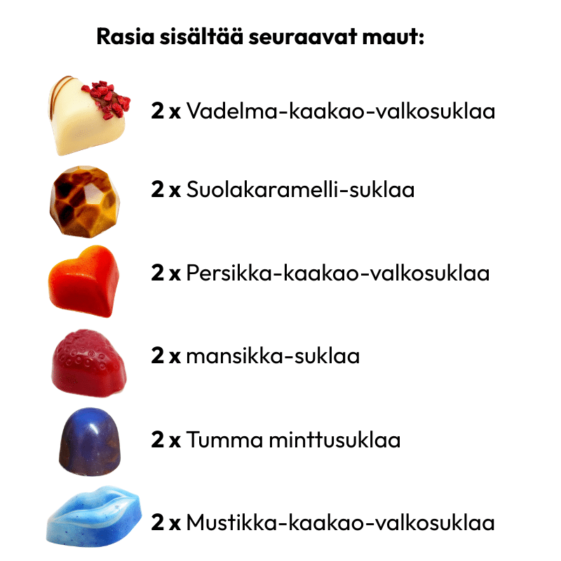 Tämä kaikille sopiva “kaiketon”, Suomessa käsityönä valmistettu 12 konvehdin lajitelma saa hymyn jokaisen huulille.
