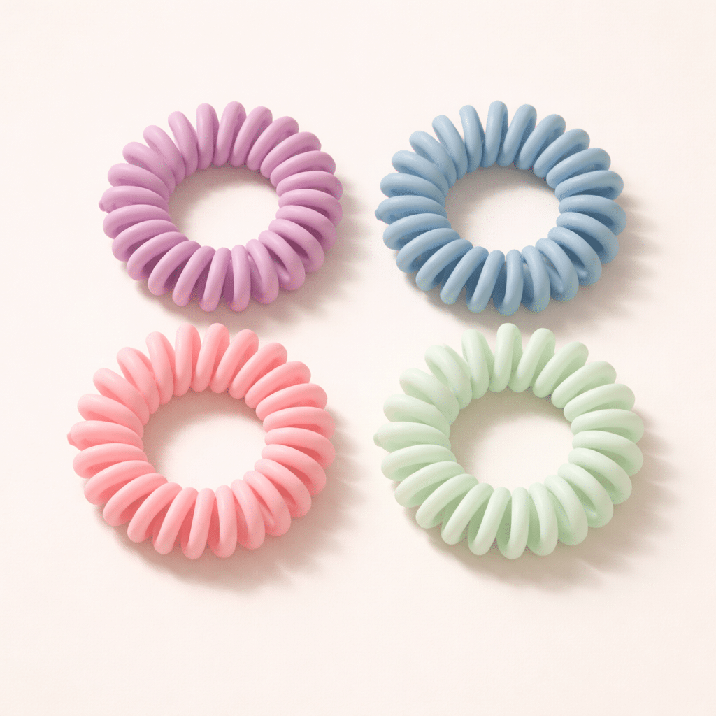 Iberon vieterihiuslenkkit ovat lasten hiuksille suunniteltuja — pehmeät, joustavat ja tarttumattomia. Vieterirakenne jakauttaa vedon tasaisesti.