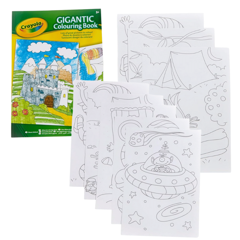 - 🖍️ Crayola Gigantic Colouring Book – 128 sivua täynnä iloisia ja monipuolisia värityskuvia eläimistä, ihmisistä ja satumaailmoista.