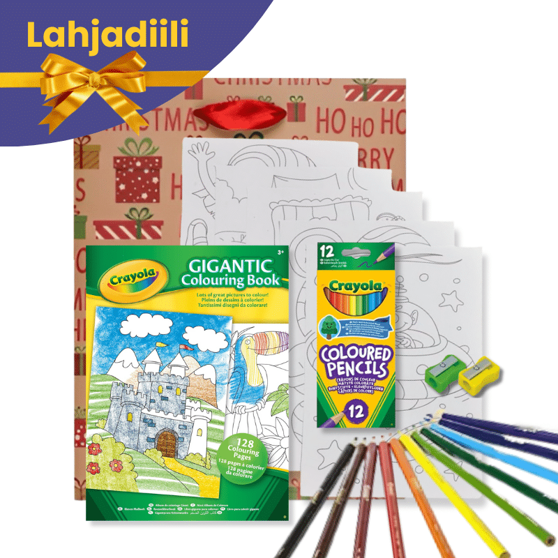 Setti sisältää Crayola Gigantic Colouring Book -värityskirjan, Crayola-värikynät, kaksi teroitinta sekä kauniin joululahjakassin.