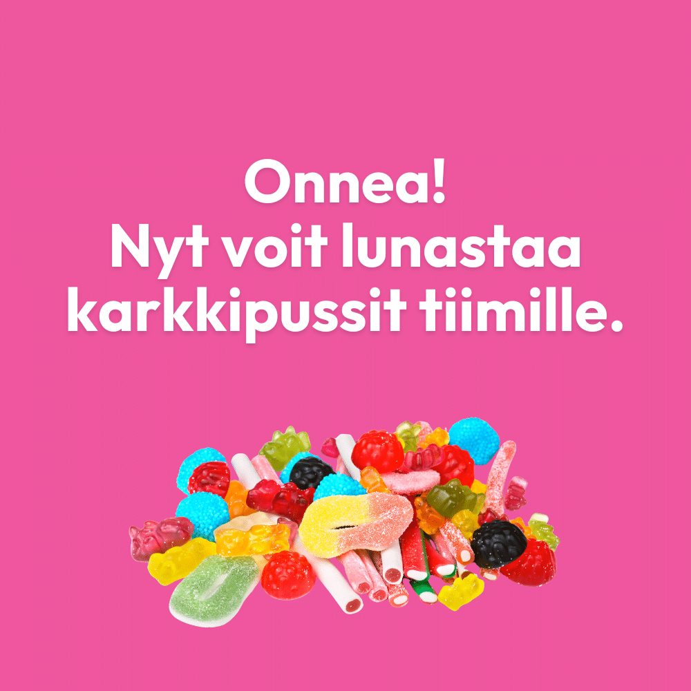 Onnittelut! Syksyn 2025 Karkkikampanja on päättynyt ja nyt pääsette lunastamaan keräämänne ilmaiset karkkipalkinnot. Lunasta karkkipalkinnot 31.1. mennessä!