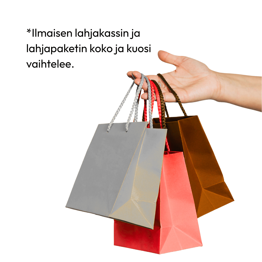 Kaunis lahjakassi tai lahjapakkaus, joka tekee lahjan antamisesta helppoa ja näyttävää. Saat yllätyksenä jonkin eri kokoisista ja kuosisista vaihtoehdoista.