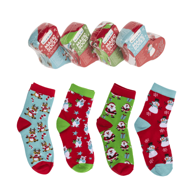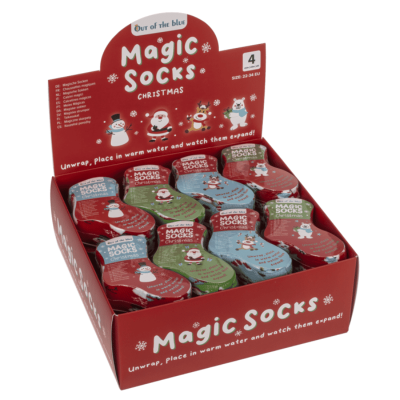 Avaa kääre, pudota pieni sukkanappi lämpimään veteen ja katso joulun taian tapahtuvan: nappi kasvaa silmiesi edessä oikean kokoiseksi, pehmoiseksi sukkapariksi! Näissä jouluisissa sukissa yhdistyy taikuus ja mukavuus – ja joustavan materiaalinsa ansiosta ne sopivat kaikkiin jalkoihin koossa 22–34. Valitse omasi neljästä hauskasta kuosista: Porot, Joulupukit, Jääkarhut, Lumiukot.