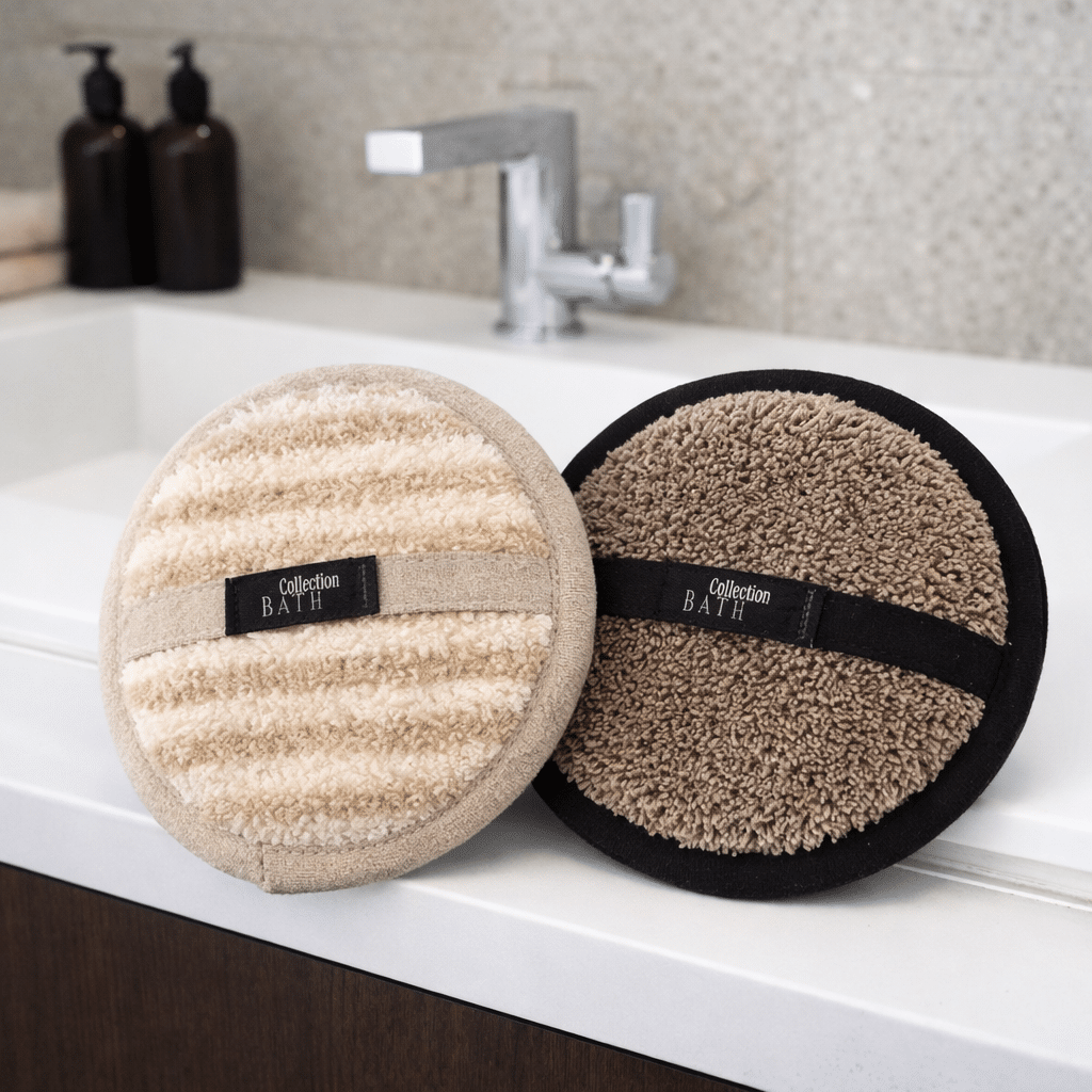 Reilun koon ansiosta käyttö on mukavaa, sillä 15cm leveänä se peittää kämmenen. Pellavaiset lankalenkit imevät hyvin kosteutta ja pesukintaassa niillä on kuoriva ja pintaverenkiertoa vilkastuttava vaikutus.