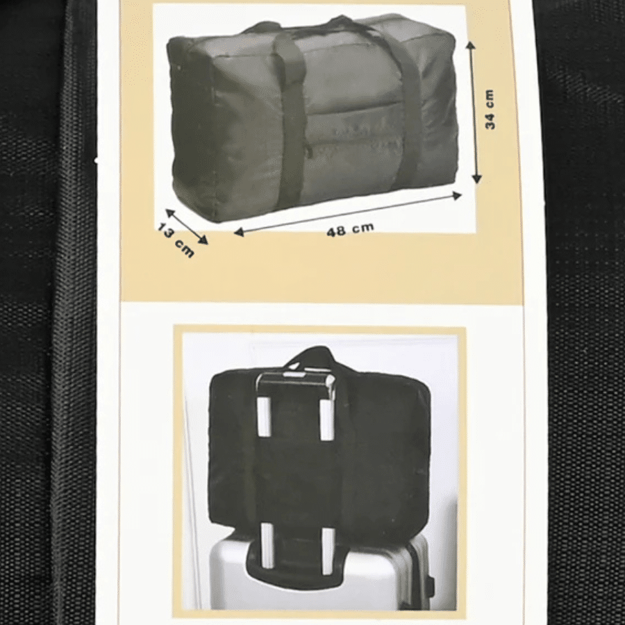 Tyhjänä pieneen tilaan taittuva laukku treeneihin, reissuun, käsimatkatavaroille, ylimääräisille ostoksille reissussa — kiinnittyy myös carry on -matkalaukun kahvaan!