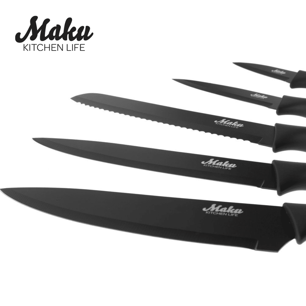 Tämä Maku Kitchen Life -veitsisetti on valmistettu korkealaatuisesta, mustaksi pinnoitetusta ruostumattomasta teräksestä, joka yhdistää modernin ulkonäön ja erinomaisen kestävyyden.