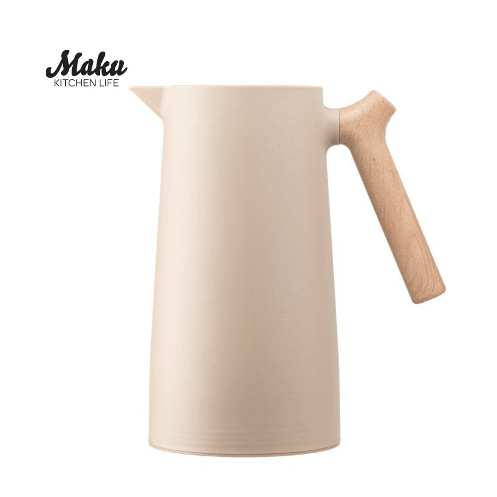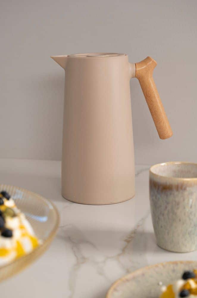 Beige design-termoskannu 1 L – lasinen sisus, puuta imitoiva kahva ja ajaton ilme. Pitää juomat kylmänä tai kuumana, kevyt käsitellä, käsinpesu.