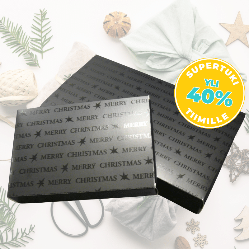 Mustalla taustalla toistuu tyylikkäästi hohtaen teksti “Merry Christmas”. Laatikko toimitetaan litteänä ja se on helppo koota.