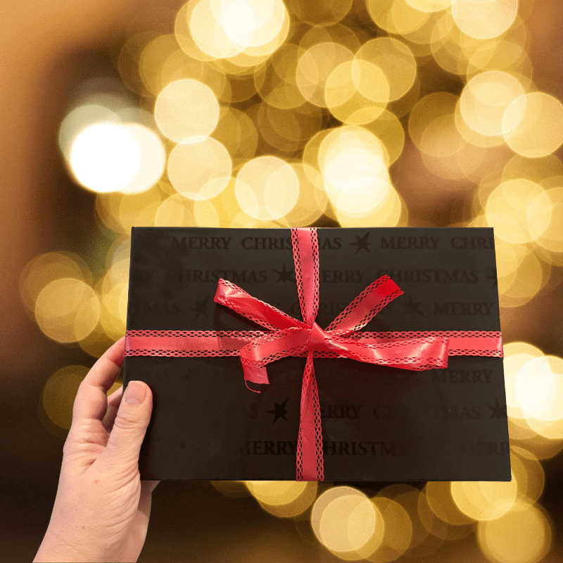 Mustalla taustalla toistuu tyylikkäästi hohtaen teksti “Merry Christmas”. Laatikko toimitetaan litteänä ja se on helppo koota. (lahjanaru ei tule mukana)