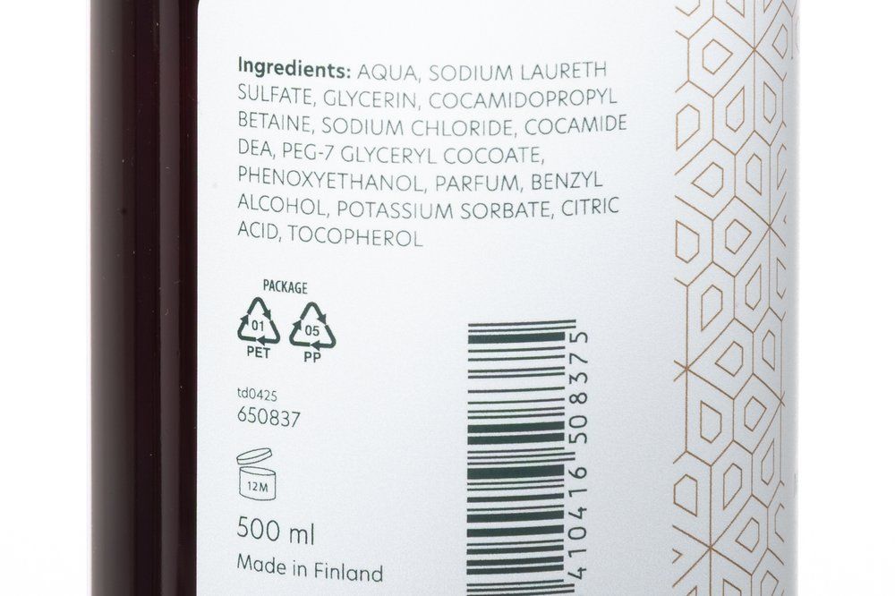 Aqua, Sodium Laureth Sulfate, Glycerin, Cocamidopropyl Betaine, Sodium Chloride, Cocamide DEA, PEG-7 Glyceryl Cocoate, Phenoxyethanol, Parfum, Benzyl Alcohol, Potassium Sorbate, Citric Acid, Tocopherol.