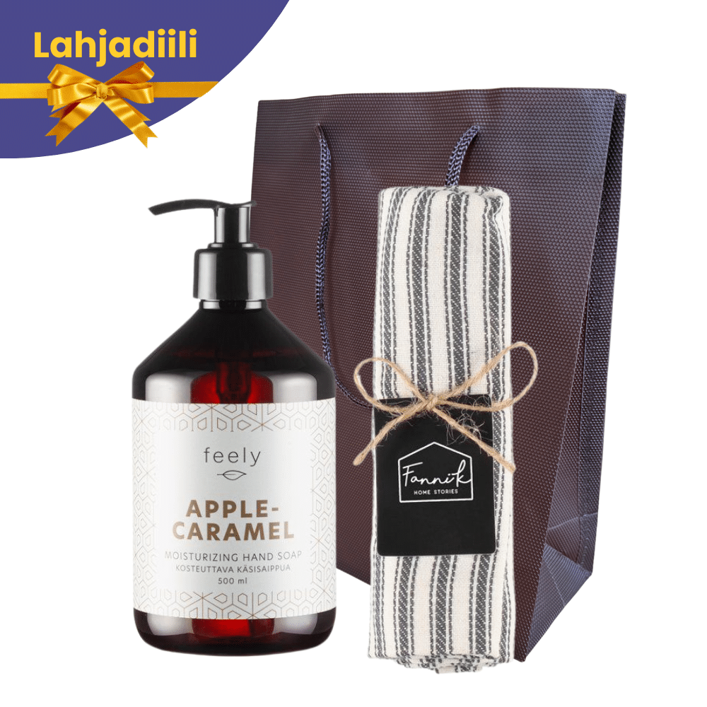 Omena-toffee käsisaippua + keittiöpyyhe lahjakassissa