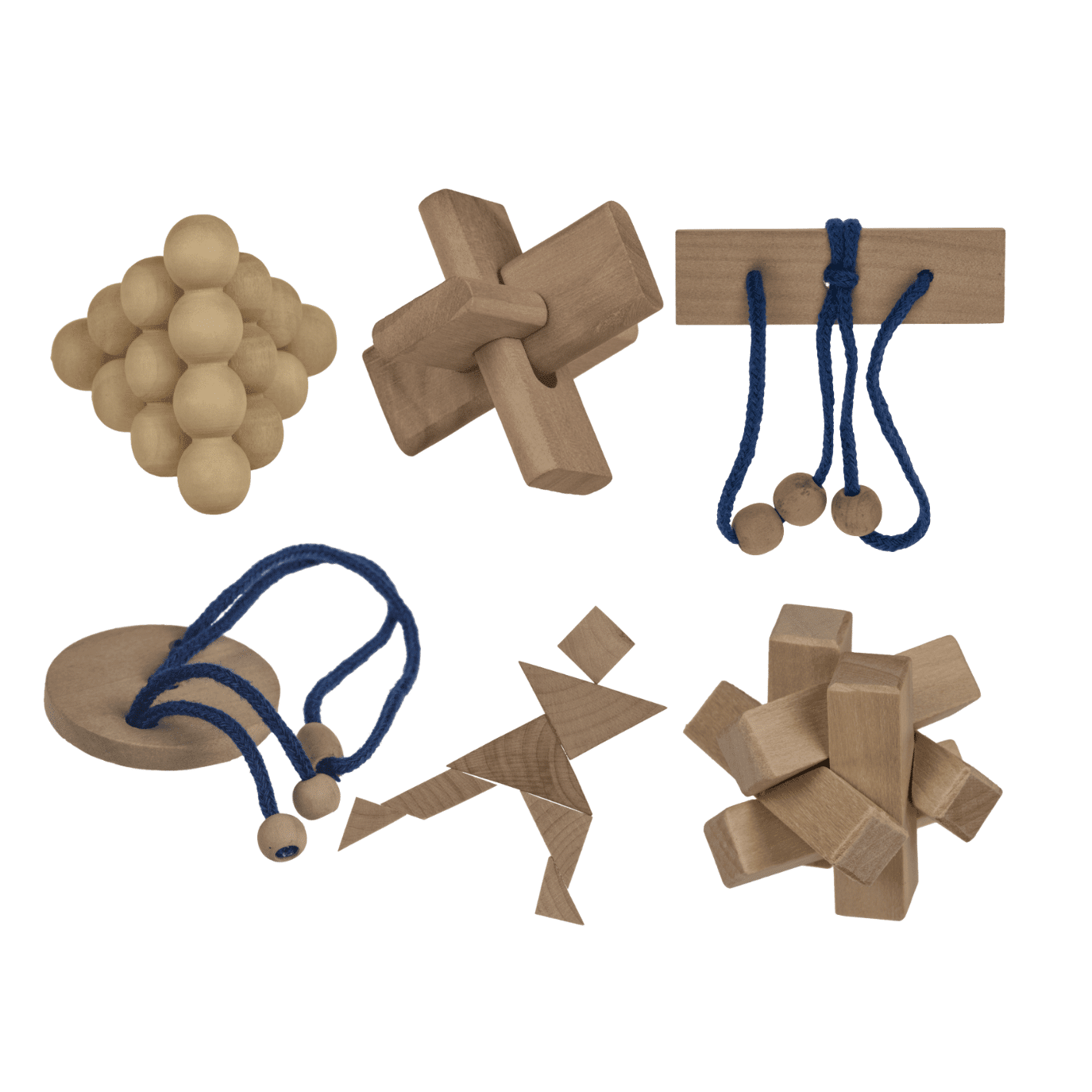 Haasta itsesi, ystäväsi tai koko perhe näillä kauniilla ja kiehtovilla puuälypeleillä! Sarjassa on 6 erilaista pulmapeliä, joista jokainen tarjoaa oman oivaltavan haasteensa – solmuista palikoihin ja geometrisiin muotoihin.