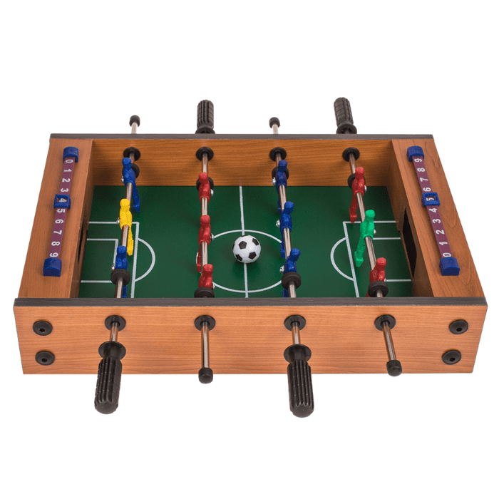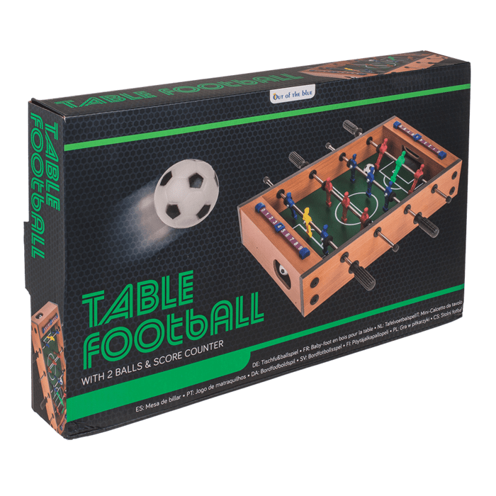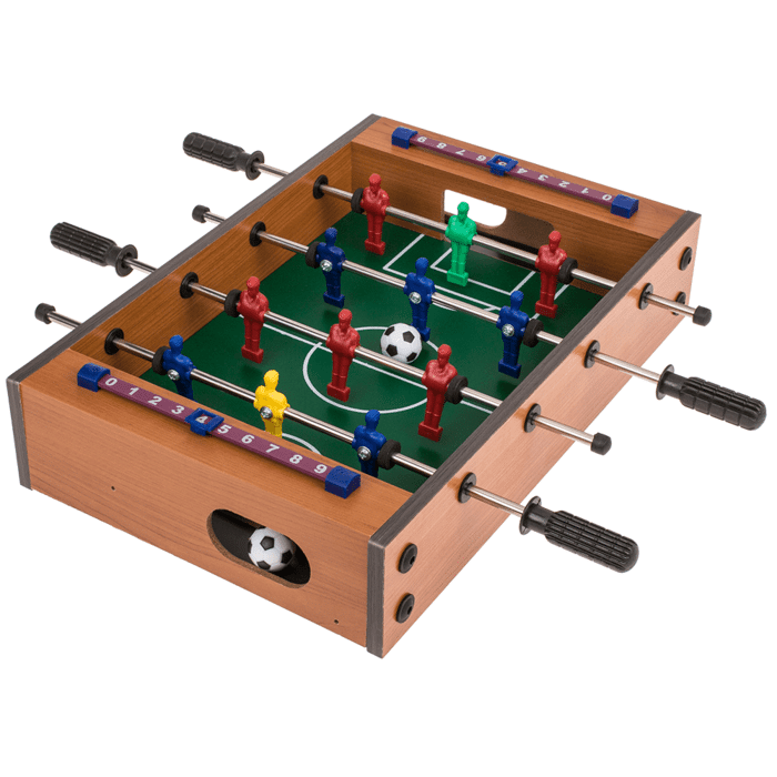 Tässä minikokoisessa, mutta täysiverisessä puupöytäjalkapallossa riittää jännitystä ja kilpailuhenkeä kaikenikäisille. Noin 33 × 21 cm kokoinen peli mahtuu helposti pöydälle, lattialle tai vaikka matkalle mukaan – mutta tarjoaa silti ison pelielämyksen!