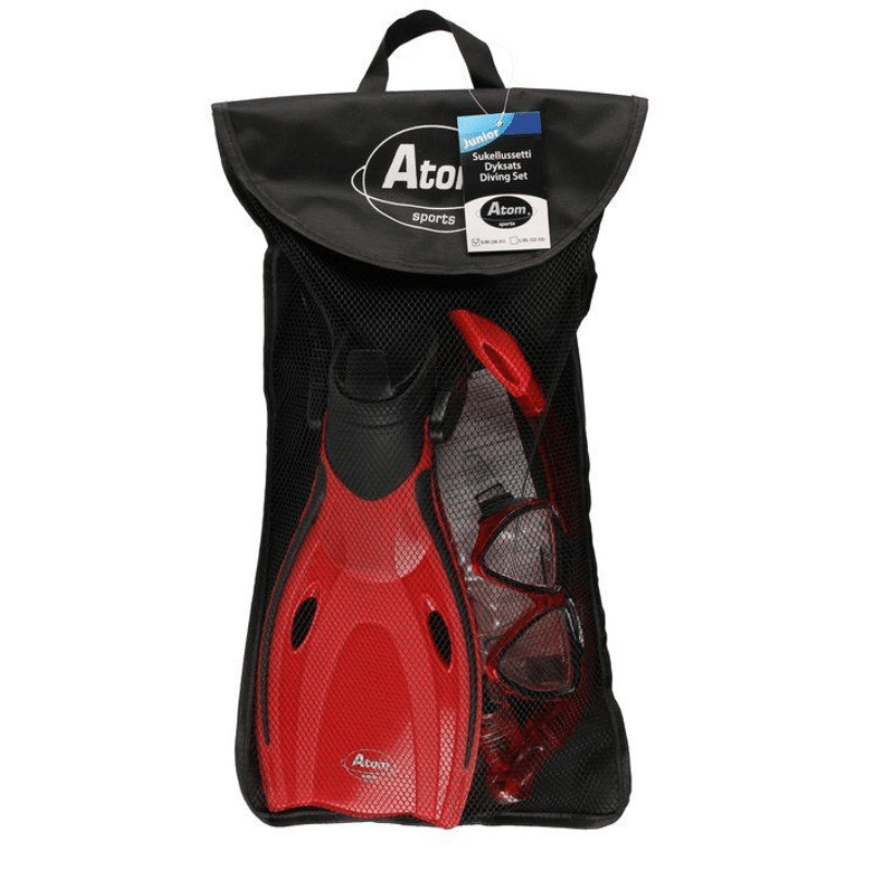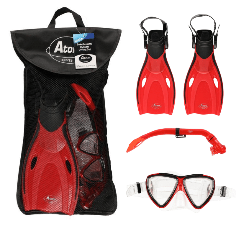 Helppokäyttöinen ja mukava Atom snorkkelisetti lapsille. Setti sisältää maskin, snorkkelin ja räpylät – kaikki mitä tarvitaan hauskoihin hetkiin vedessä.