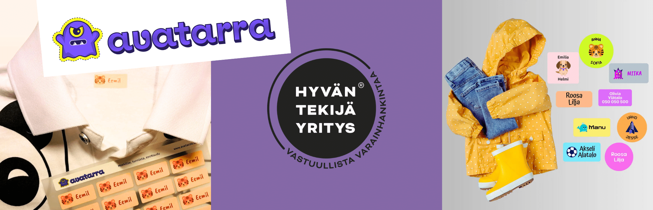 Meiltä saat iloiset ja kestävät nimitarrat, jotka pitävät lasten vaatteet ja tavarat tallessa. Helppo kiinnitys ja persoonalliset kuvat tekevät vaatteiden merkkaamisesta ja löytämisestä sujuvampaa ja hauskempaa! Valikoimamme rohkeat värit ja uniikit kuvitukset erottuvat perinteisestä – söpöt hirviöt ja rohkeat kuosit ovat lasten suosikkeja, tuoden iloa jokaiseen päivään.